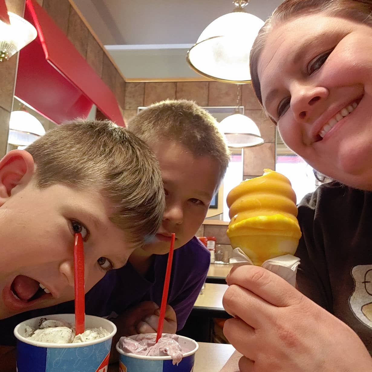 Stole the boys and ran away to Oregon... Because it's there! We ate lunch and discussed the world's best root beer, got free cupcakes, saw Sonic and ate ice cream. They accidentally made one blizzard too big, hence the angry look on big brother's face.